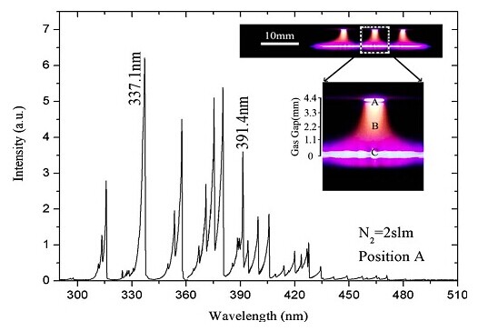等離子體發(fā)射光譜研究是了解放電條件下氣體狀態(tài)的有效手段和用于無干擾診斷等離子體狀態(tài)參數(shù)的方法。它為研究不同實(shí)驗(yàn)參數(shù)下的等離子體行為提供了一種很好的方法。通過采集射頻磁控濺射過程中等離子體發(fā)射光譜,可以計(jì)算出電子密度和電子溫度,并且能夠分析濺射功率、工作壓強(qiáng)等實(shí)驗(yàn)參數(shù)對(duì)等離子體狀態(tài)的影響。荷蘭Avantes公司的AvaSpec-ULS2048高分辨率、多通道光纖光譜儀,波長范圍200-1100nm,光譜分辨率(FWHM)0.1nm。下圖是氮分子(N2)的發(fā)射光譜數(shù)據(jù)。