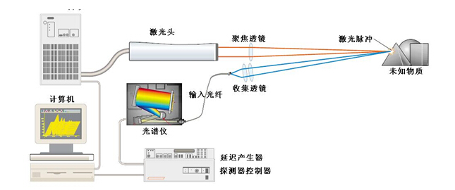 在如此之高的激光功率密度作用下,被測材料表面就會有幾微克的物質(zhì)被噴射出來,這個過程通常被稱為激光剝離,同時材料表面還會產(chǎn)生壽命很短但亮度很高的等離子體,其瞬間溫度可達10,000℃。在這個熱等離子體中,噴射出來的物質(zhì)離解成激發(fā)態(tài)的原子和離子。在激光脈沖結(jié)束后,由于等離子體以超音速向外擴展所以迅速地冷卻下來。在這段時間內(nèi),處于激發(fā)態(tài)的原子和離子從高能態(tài)躍遷到低能態(tài),并發(fā)射出具有特定波長的光輻射。用高靈敏度的光譜儀對這些光輻射進行探測和光譜分析分析,就可以得到被測材料的元素構(gòu)成信息。