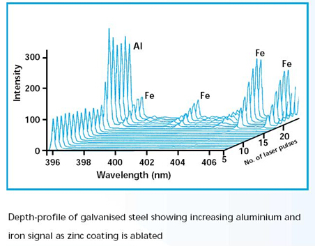 由于激光可以以一種可控的方式來清除表面涂層,因此分層結(jié)構(gòu)的深度輪廓分析可以用LIBS技術(shù)來進行。 在激光不斷“鉆入”到被測材料中的同時用光譜儀對其產(chǎn)生的光輻射進行光譜測量,就可以得到被測材料的構(gòu)成成分元素隨深度變化的函數(shù)。通常這一技術(shù)只能用于那些在典型LIBS系統(tǒng)中激光器的參數(shù)下比較容易去除的材料。比如在鋼材上鋅鍍的過程控制中的成分分析,探測油漆中的重金屬(鉛、鈾、钚等),檢測混凝土的成分污染等。