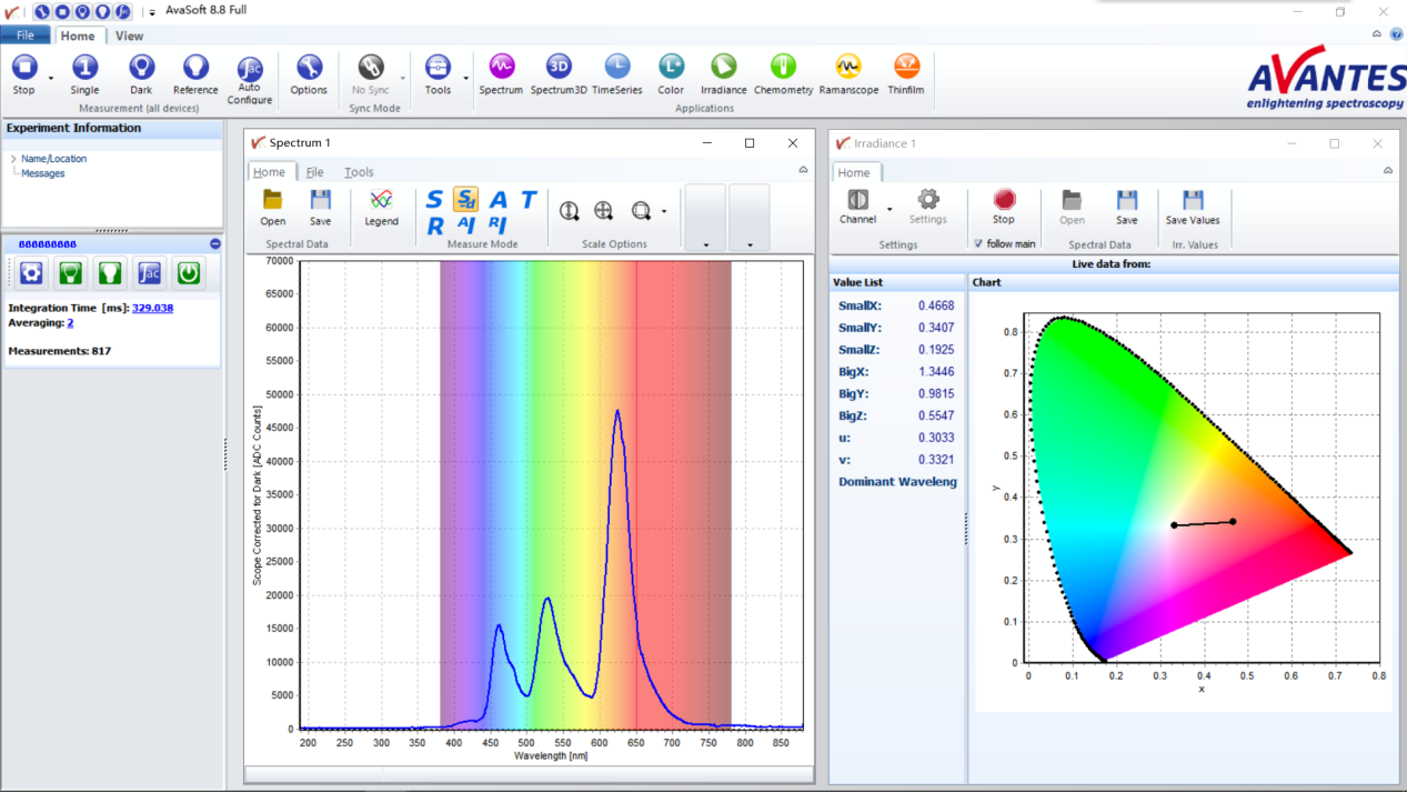 圖3 實(shí)時(shí)監(jiān)測(cè)各參數(shù)變化 2.2 測(cè)量方法 圖4 屏幕測(cè)量示意圖 2.3 測(cè)量項(xiàng)目 LCD和OLED屏幕測(cè)量有很特別的應(yīng)用需求,Avantes在顯示屏幕領(lǐng)域研究多年,公司在配置系統(tǒng)和應(yīng)用方面有豐富的經(jīng)驗(yàn),可以幫助客戶配置適合其應(yīng)用的系統(tǒng)。主要測(cè)量項(xiàng)目: 1. 顯示屏的亮度、色度、光譜; 3.結(jié)論 經(jīng)典配置為: 光譜儀AvaSpec-ULS2048CL-EVO; 通光狹縫25或50微米; 測(cè)量范圍360-1000nm; 分辨率(FWHM)為1.4-2.4nm; 2米長(zhǎng)專業(yè)測(cè)量光纖(FC-UVIR200-2-ME),光纖的測(cè)量端配有直徑3.9mm的余弦校正器(CC-UV/VIS)。 整個(gè)系統(tǒng)用NIST可溯源標(biāo)準(zhǔn)光源在特定的波長(zhǎng)范圍做特定的輻射定標(biāo)(μW/cm2/nm),定標(biāo)后的系統(tǒng)可用AvaSoft-IRRAD軟件來(lái)測(cè)量并得到以下參數(shù):X, Y, Z, x, y, z, u, v, CRI、色溫、主波長(zhǎng)、補(bǔ)色主波長(zhǎng)、半高寬、峰值波長(zhǎng)、色差ΔE等。此外,原始數(shù)據(jù)和色坐標(biāo)也可以顯示??蛻艨捎肁vantes提供的動(dòng)態(tài)鏈接庫(kù)(DLL)可通過(guò)C#、C++及其他的編譯環(huán)境進(jìn)行二次開發(fā)。