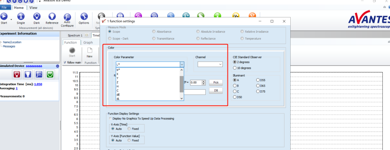 在AvaSoft-FULL軟件中的歷史通道功能,使我們可以很方便的監(jiān)視L*a*b值、XYZ值、色差Δu、Δv、ΔE色差等參數(shù)隨時(shí)間的變化情況,甚至我們還可以自定義一些參量,并觀察它們隨時(shí)間的變化,軟件也可以同時(shí)監(jiān)測(cè)多個(gè)參數(shù)隨時(shí)間的變化。