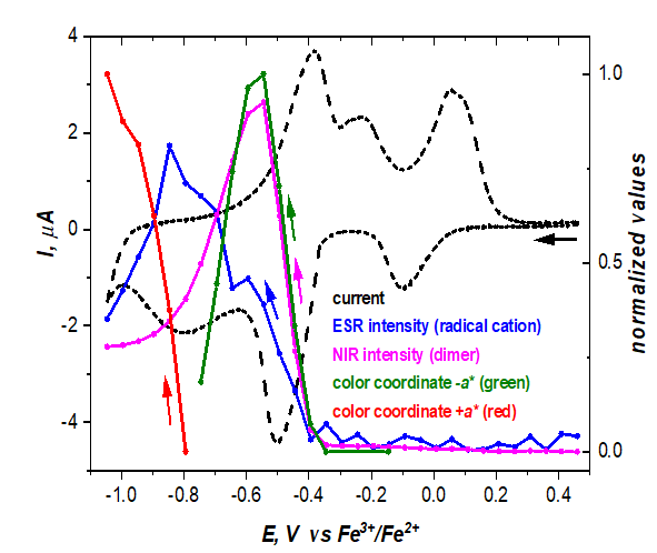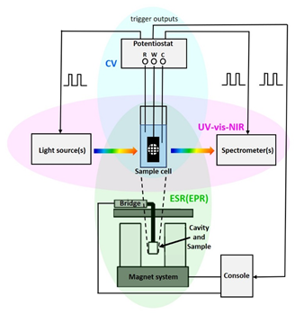 電子自旋(順磁)共振(ESR/EPR) 光譜是檢測(cè)和表征含有未配對(duì)電子的結(jié)構(gòu)(例如有機(jī)自由基、過(guò)渡金屬離子)的方法。中性有機(jī)分子中電子轉(zhuǎn)移的主要步驟導(dǎo)致自由基離子的形成,這可以通過(guò) ESR 光譜明確證實(shí)。第二次電子轉(zhuǎn)移通常導(dǎo)致抗磁結(jié)構(gòu)。紫外-可見(jiàn)-近紅外光譜提供有關(guān)順磁性和反磁性物質(zhì)的光學(xué)特性的信息。